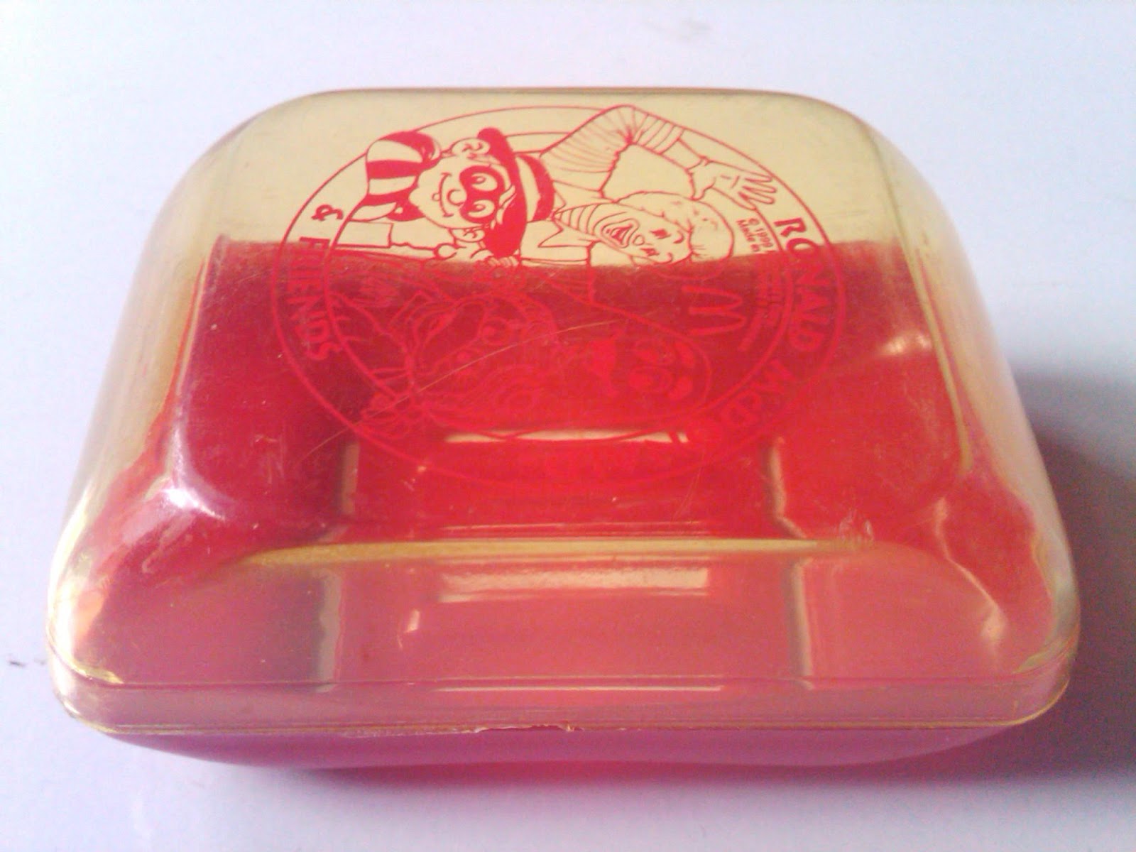 Sekilas item ini terlihat sepele sih.. tapi buat yang suka barang-barang logo McDonalds, wadah sabun berbahan plastik keluaran tahun 1999 ini lumayan susah dicari. Alasnya berwarna merah dengan tutup warna kuning transparan.