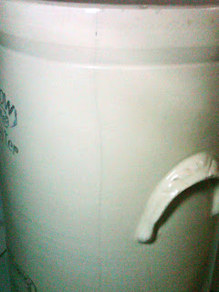Kondisi filter apa adanya; tanpa kran dan tutup, ada beberapa retakan tak tembus, chip di bagian mulut filter, dan ada lubang di filter bagian dalam (lihat gambar). Keramiknya sudah retak seribu dan ada beberapa noda karena usia. Untuk dipajang sebagai barang antik, tampilan filter air ini masih lumayan.