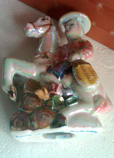Sebuah patung keramik era 1996, motif oriental dengan glasir karnival. Tinggi patung + 12,3 cm. Kondisi utuh dan bagus, hanya bagian alas ada noda bekas coretan yang tidak mempengaruhi tampilan patung ketika dipajang.