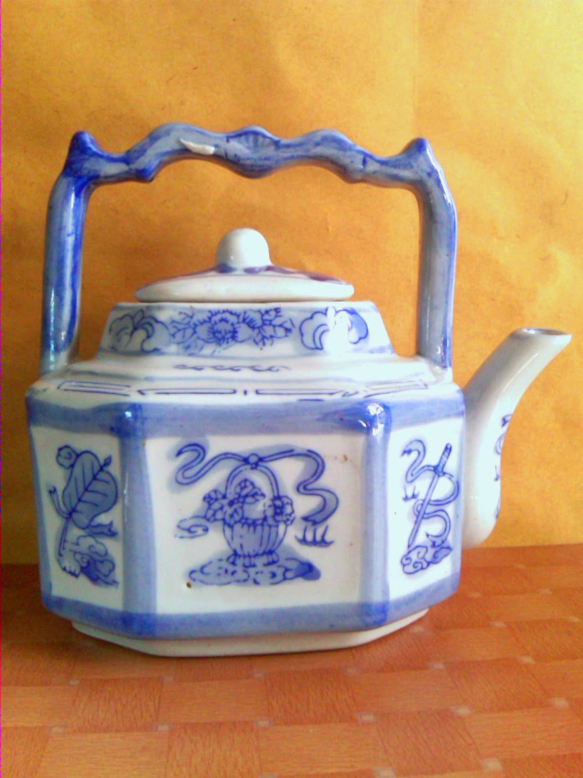 Poci porselen biru putih dengan handle model ketel bermotif oriental. Dimensi poci plus tutup