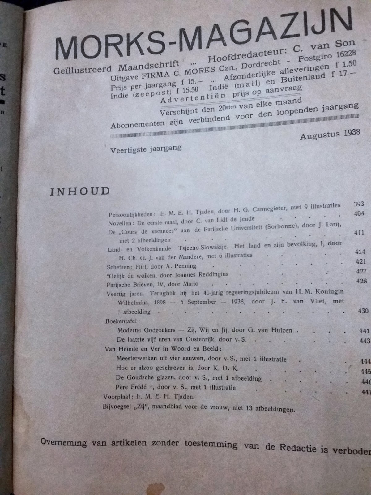 Morks Magazijn Agustus 1938 terbitan firma C. Morks Cz. – Dordrecht. Tulisan